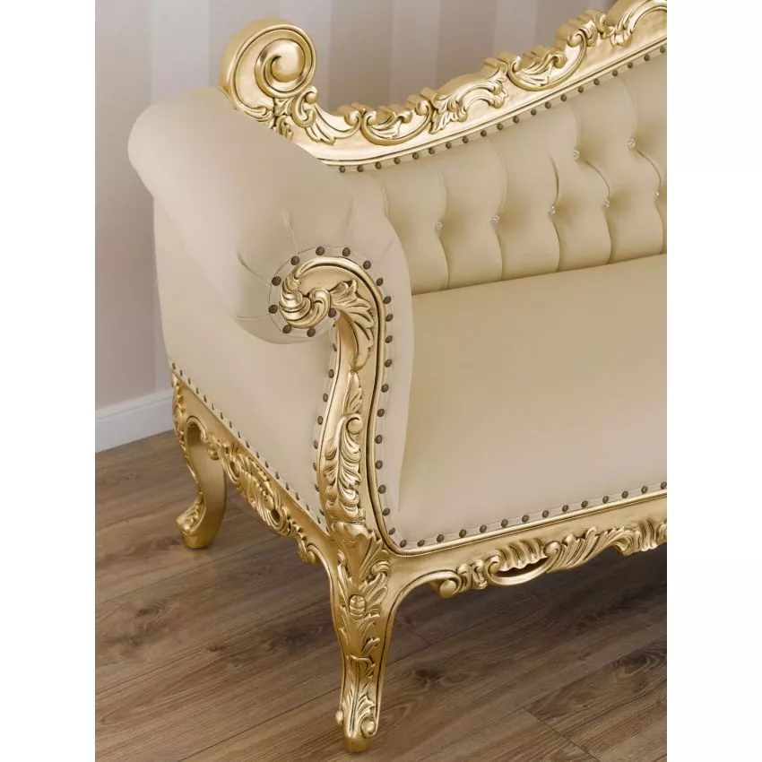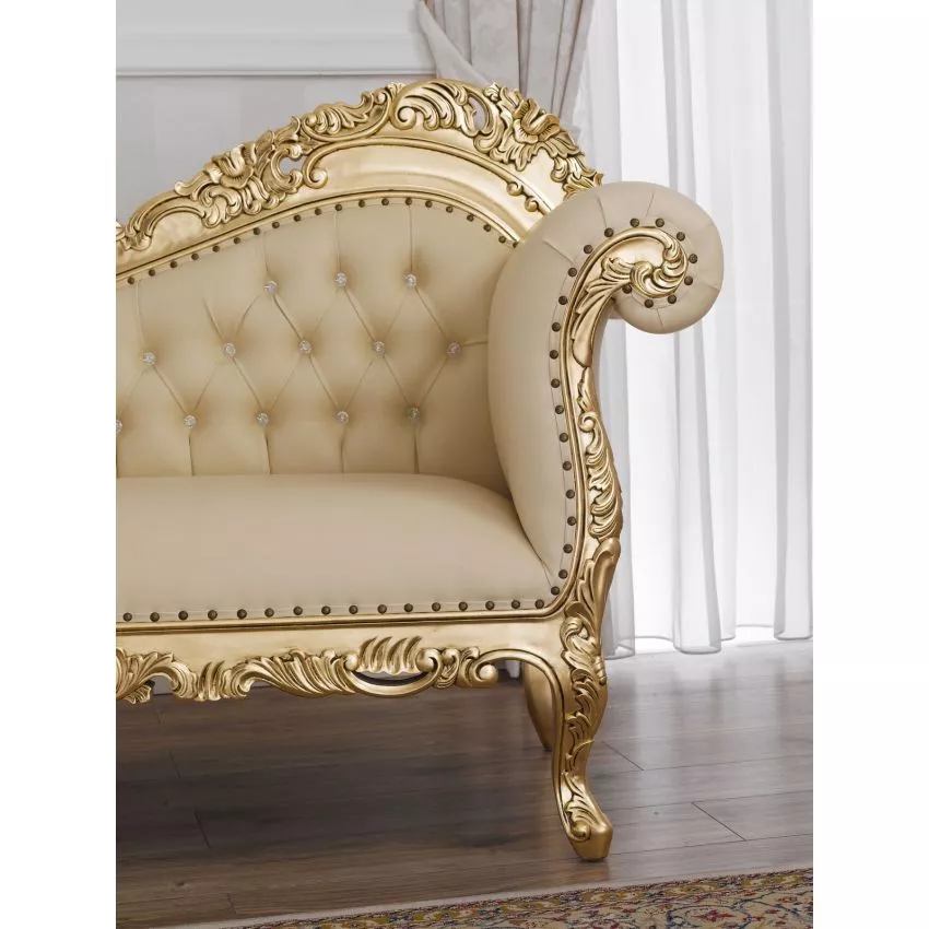 Alejandra Hand Carved Teak Wood Leatherette 3-Seater Chaise Longue Sofa ( Golden & Beige )