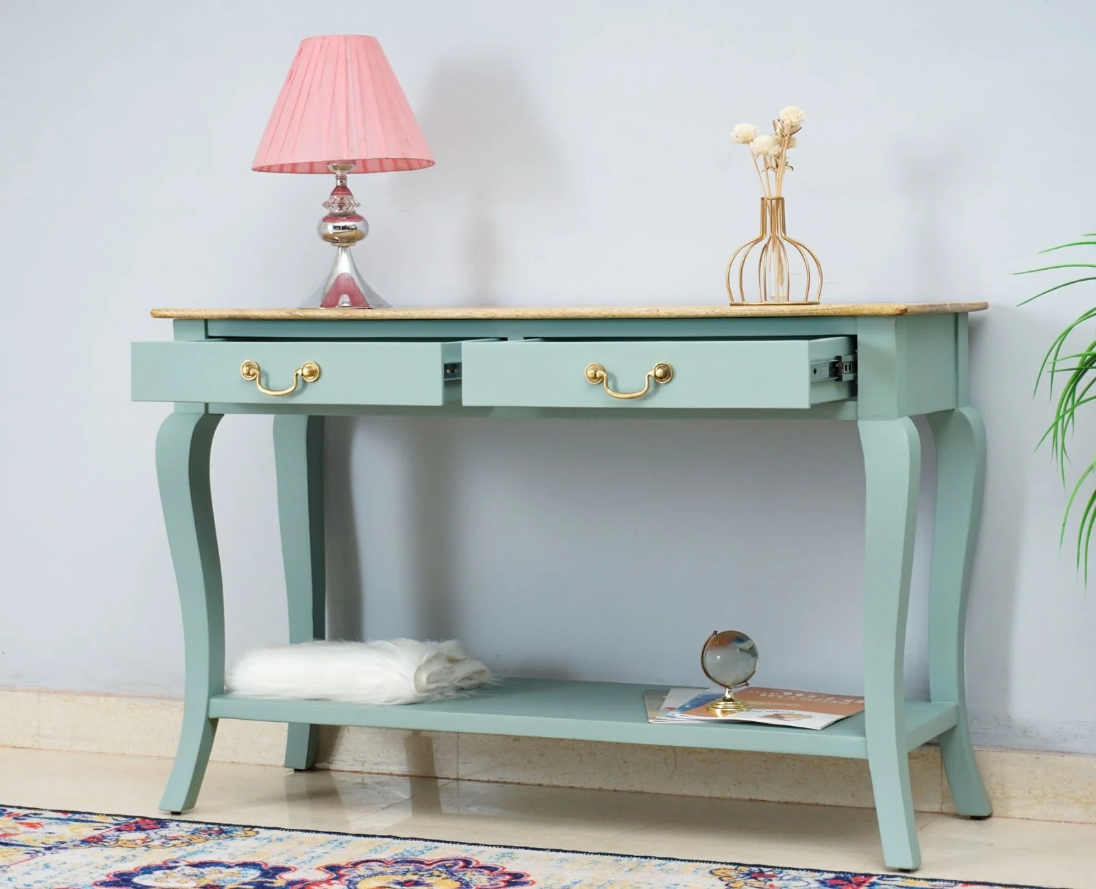 Be the first to review “Alexandria Teak Wood Console Table with 2 Drawer Storage Rack for Living Room (Silt Green)”