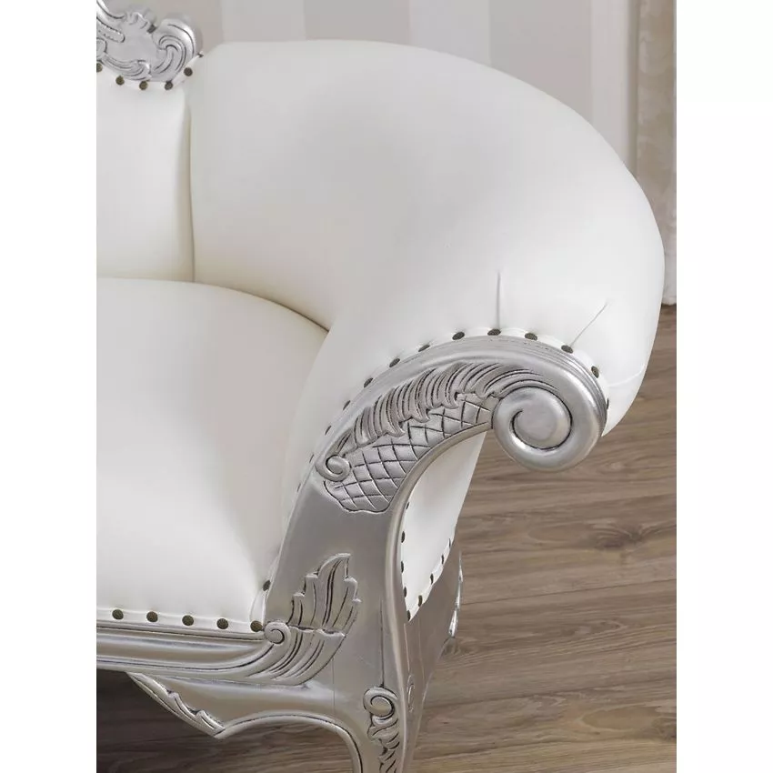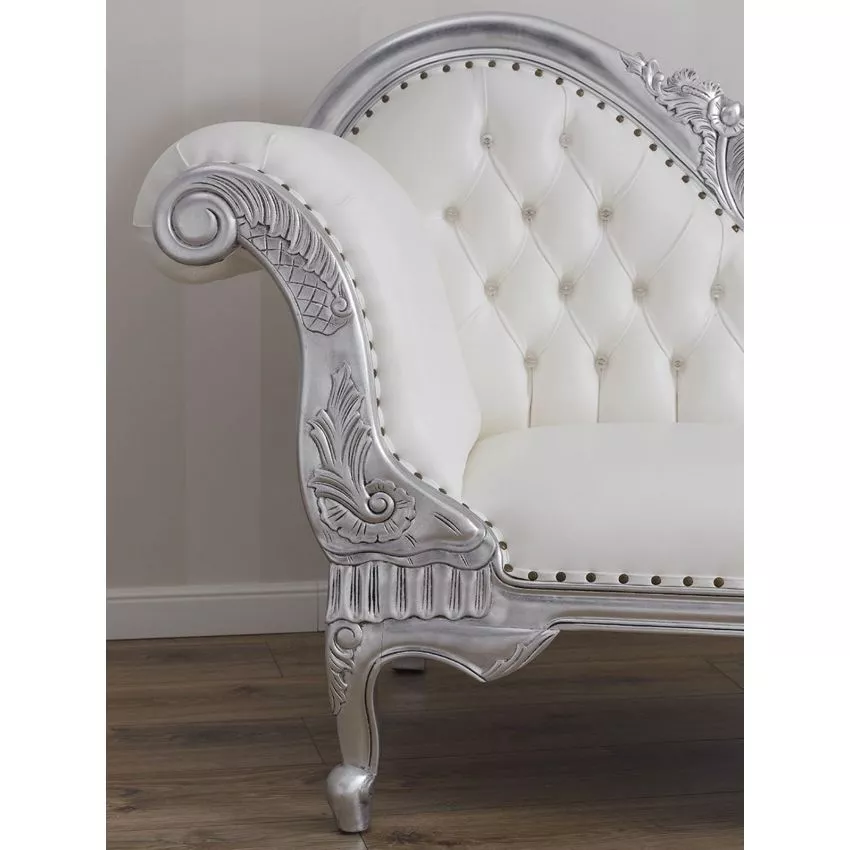 Baroque Style Hand Carved Button Tufted Teak Wood 3-Seater Chaise Longue Silver Finish ( White )