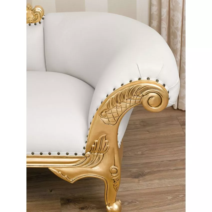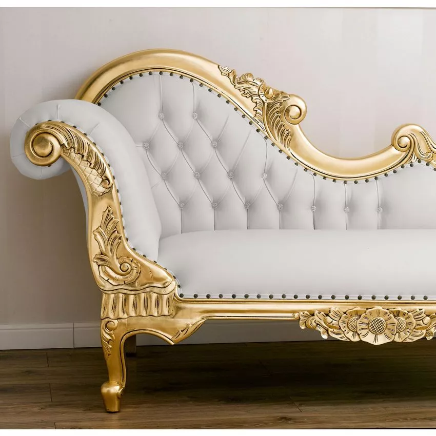 Baroque Style Hand Carved Button Tufted Teak Wood 3-Seater Chaise Longue ( White & Golden)