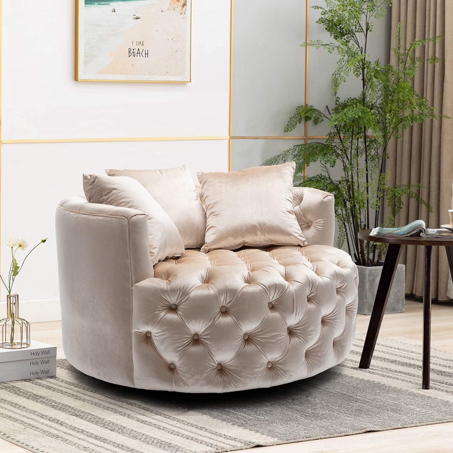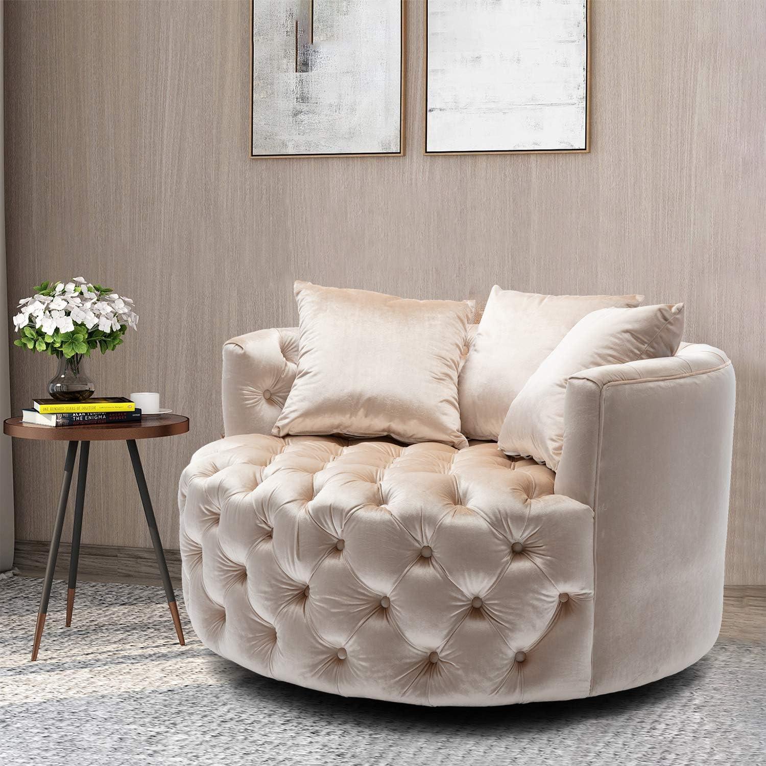 Barrel Button Tufted Design Modern Round Sofa For Living Room with 3 Pillows ( Beige )