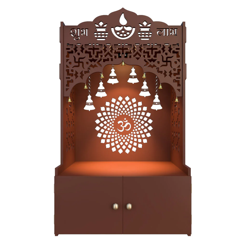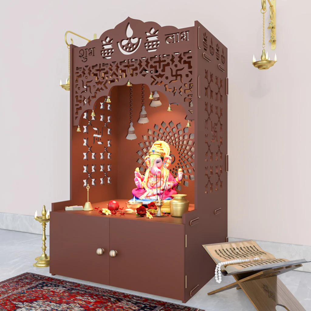 Its compact yet spacious design is ideal for small to medium-sized homes, offering enough room to place your idols, incense holders, and prayer essentials. The elevated platform and ornate details reflect classic Indian temple architecture, creating an authentic sacred environment for your daily worship.
