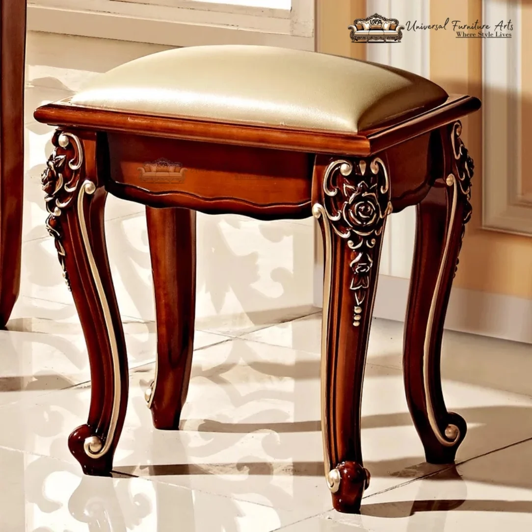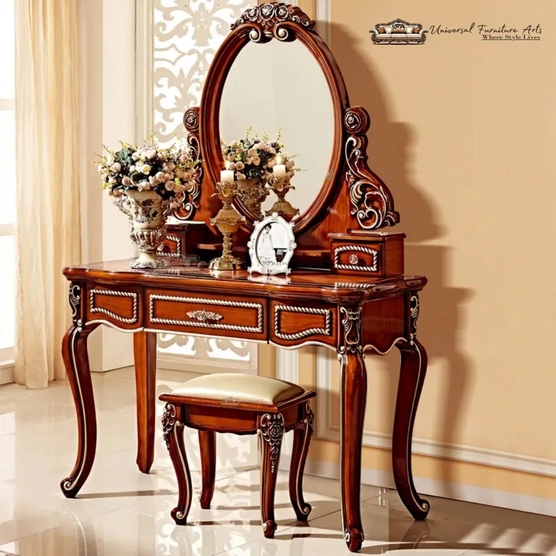 Transform your bedroom or dressing area into a luxurious sanctuary with this elegant vintage wooden vanity set. Featuring an exquisite oval mirror and intricately designed carvings, this piece effortlessly blends timeless style with modern function. The rich wood finish and delicate detailing make it the perfect focal point for any room. Includes a matching stool for added comfort, with additional space for storage in the drawers.