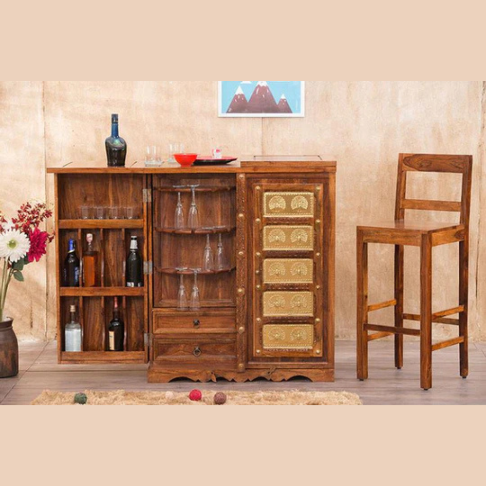 Elevate your home bar setup with the Natural Art & Crafts Handmade Teak Wood Bar Cabinet, a stunning blend of rustic elegance and modern design. This bar cabinet offers ample storage for your favorite wines, liquors, and glassware, making it the perfect centerpiece for any living room, dining area, or entertainment space. Expertly crafted from premium teak wood, this cabinet not only provides durability but also adds a timeless touch of sophistication to your home. The cabinet’s sleek design ensures it fits seamlessly into both classic and contemporary decor styles, offering both function and aesthetic appeal.