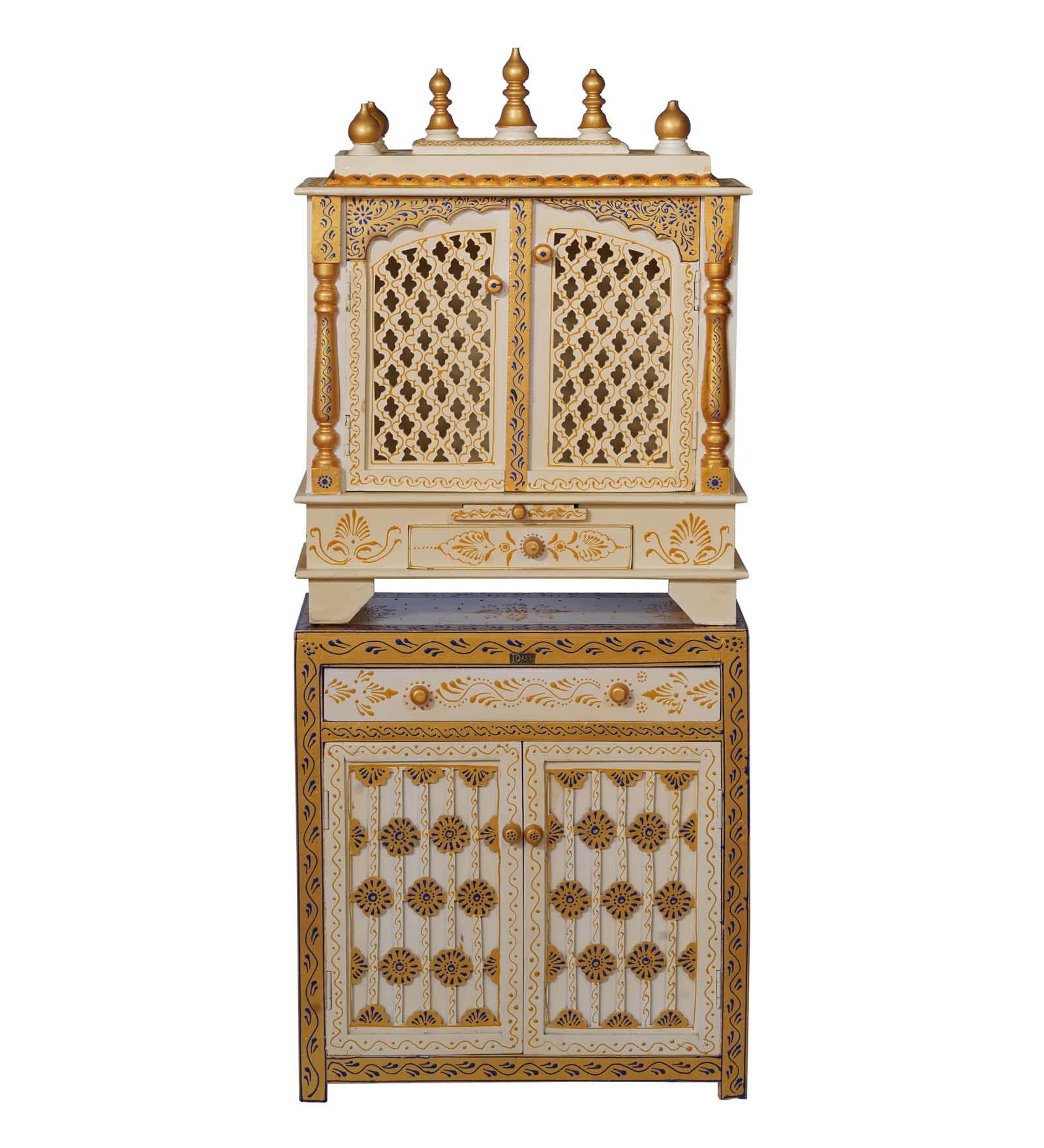 Its compact yet spacious design is ideal for small to medium-sized homes, offering enough room to place your idols, incense holders, and prayer essentials. The elevated platform and ornate details reflect classic Indian temple architecture, creating an authentic sacred environment for your daily worship.