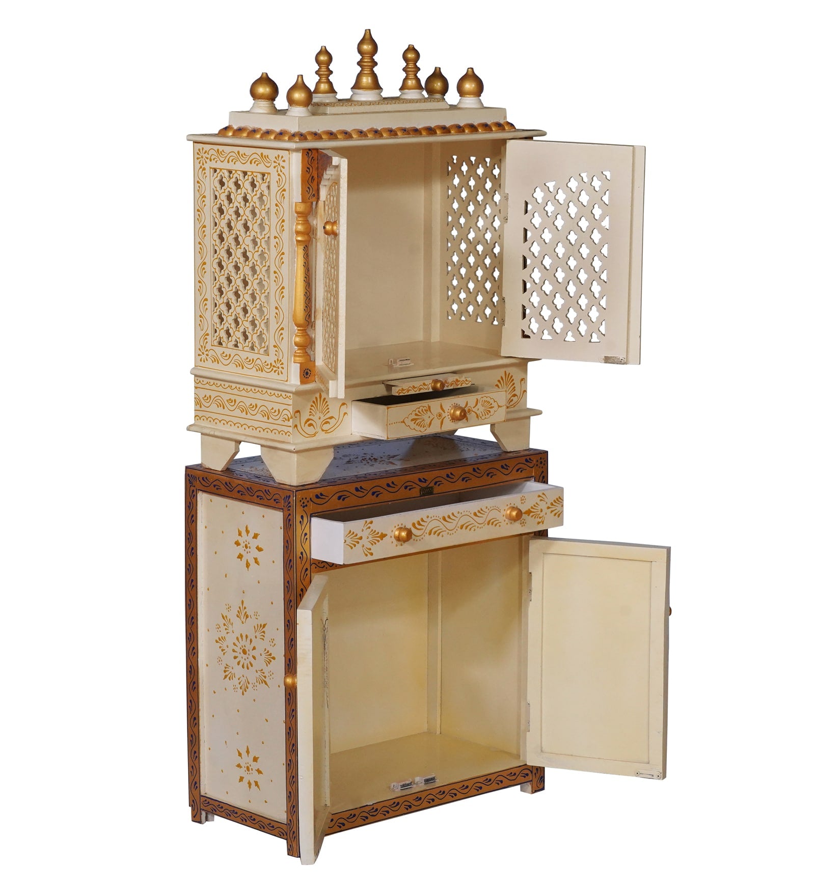 Mandap Traditional Handmade Teak Wood Pooja Temple with Storage for Daily Prayers (Antique White & Golden)