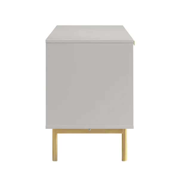 Modern TV Unit with Golden Legs & Handle Matte Finish, featuring a matte ivory finish, golden metal legs, and matching gold handles for a luxurious touch. The clean, ribbed front design hides ample storage space for set‑top boxes, media accessories, and daily essentials, while the open center niche with wire‑management hole keeps cables neat and organized. Perfect as a TV cabinet, console, or sideboard, this unit blends seamlessly with contemporary, minimalist, and luxe interiors.