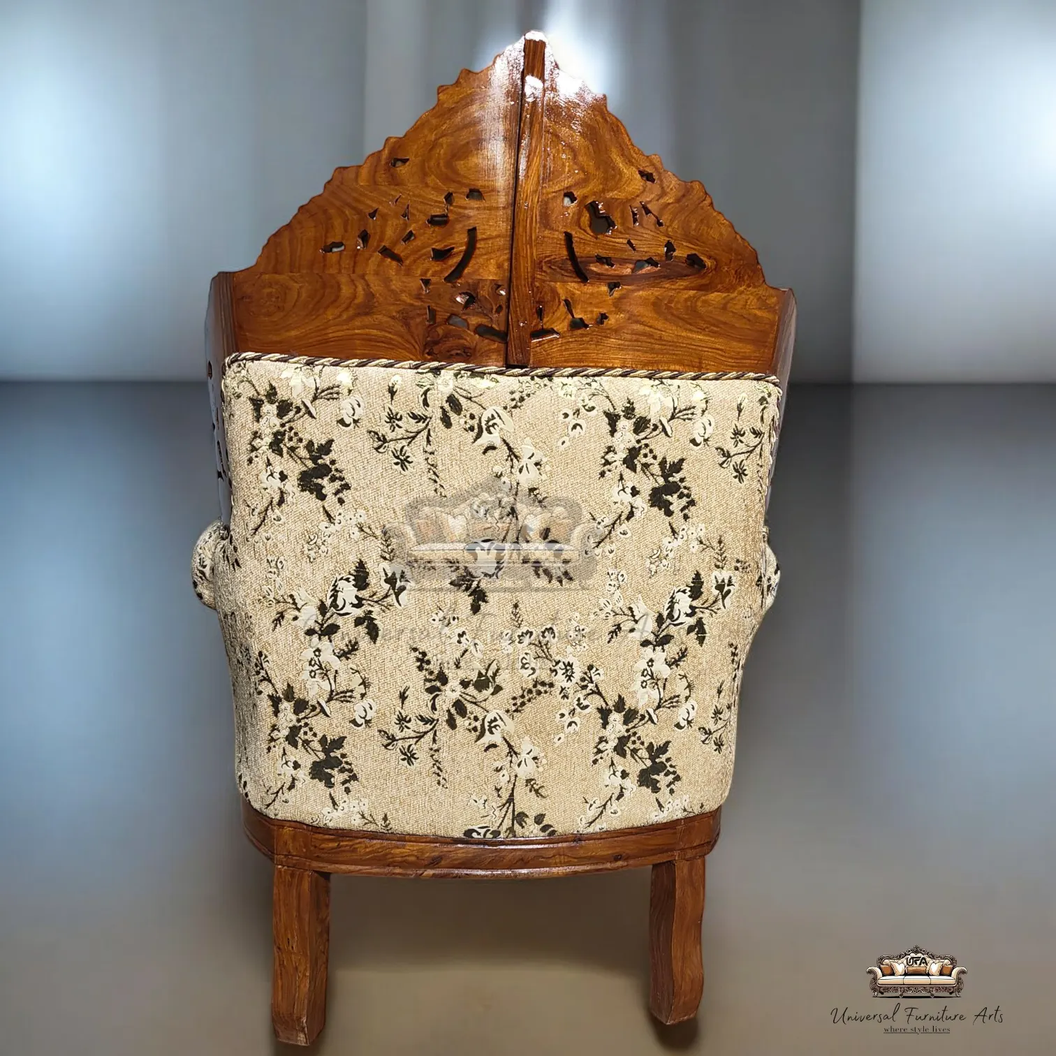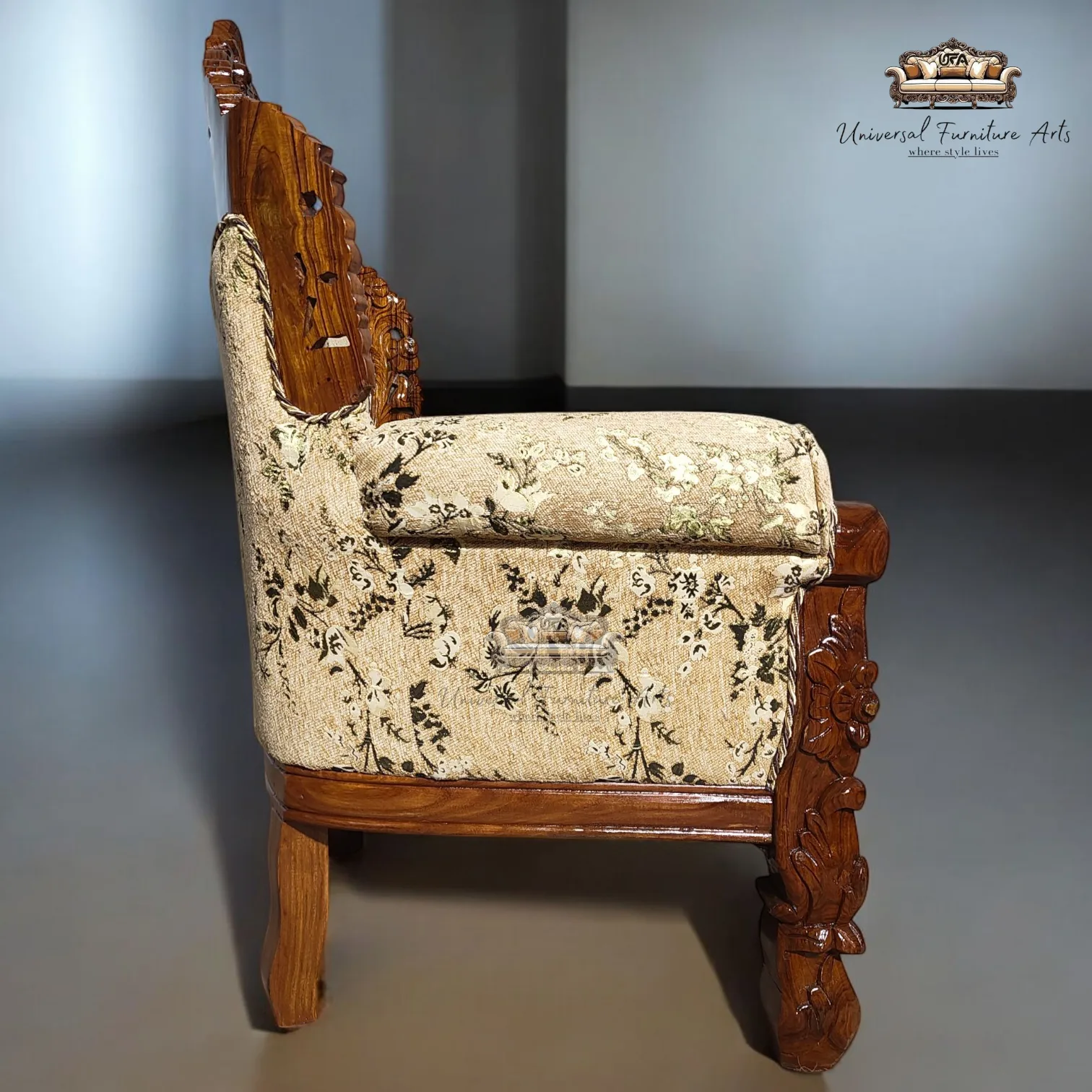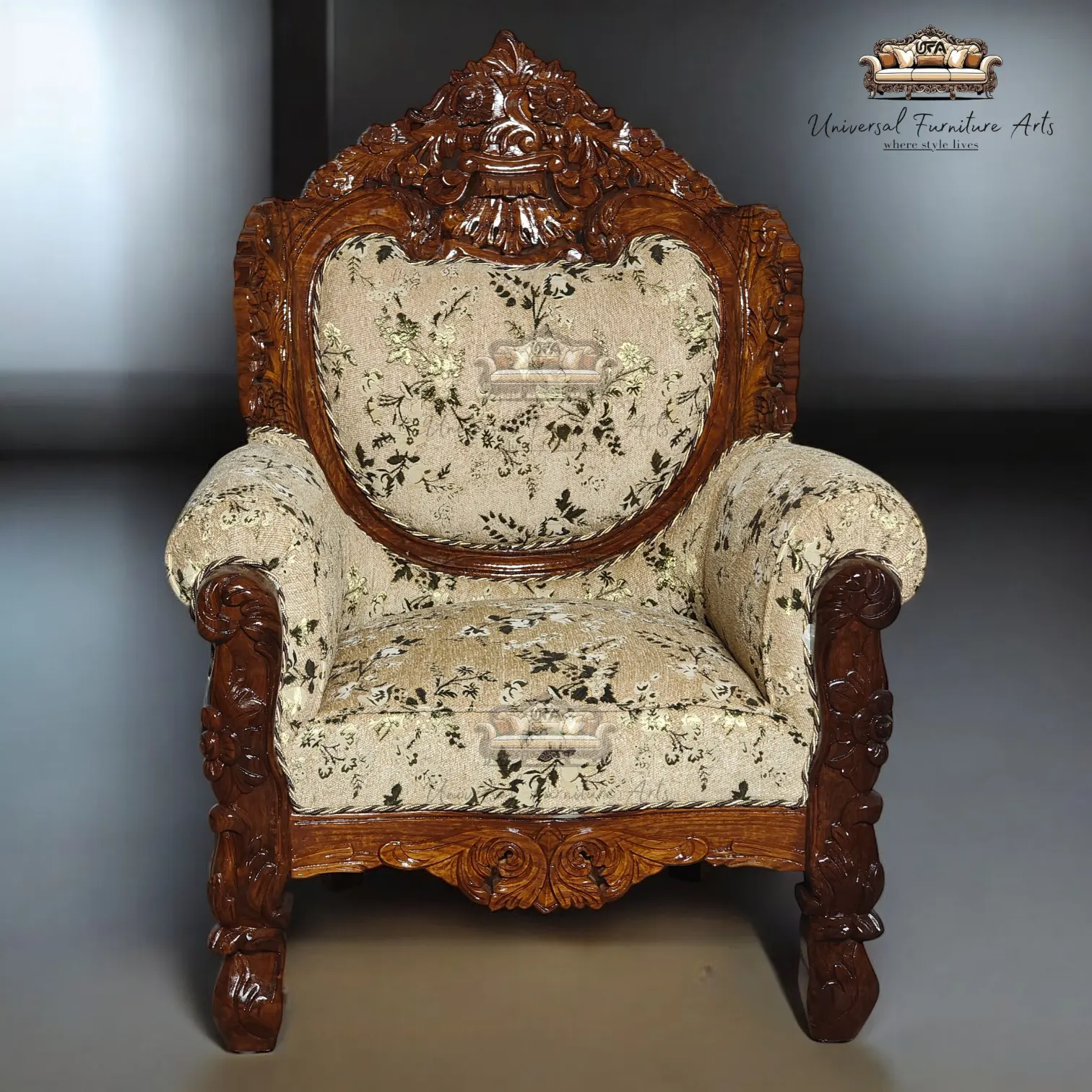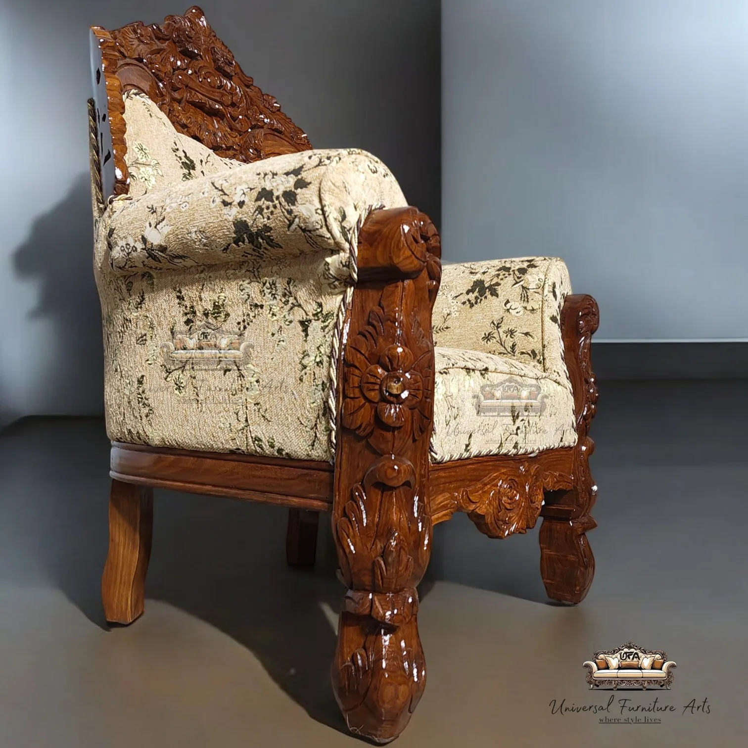 Crafted from high-quality solid wood, the frame features exquisite hand carvings on the backrest, arms, and legs, showcasing the skill of expert artisans. The plush cushioned seat and backrest are upholstered in premium fabric, offering unmatched comfort along with visual appeal.