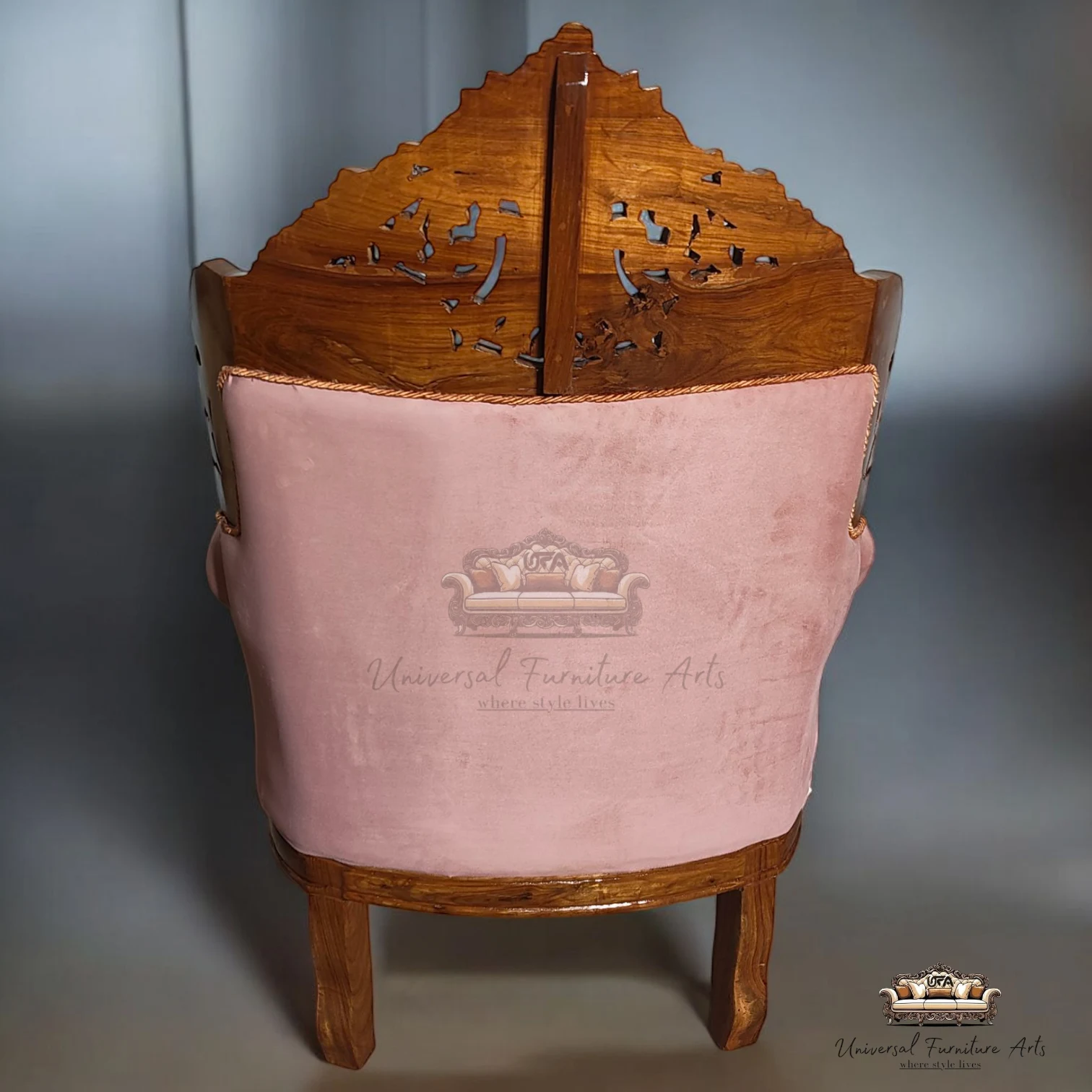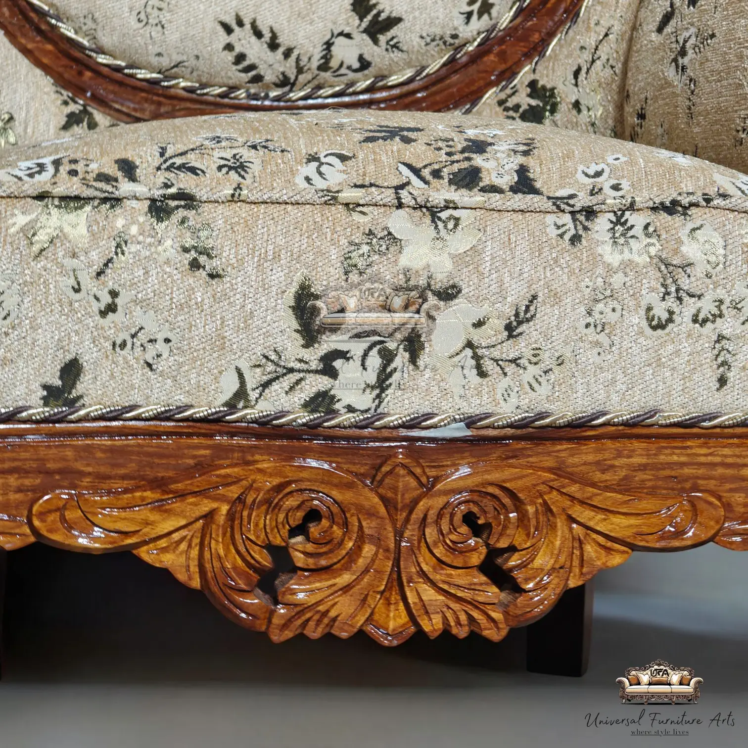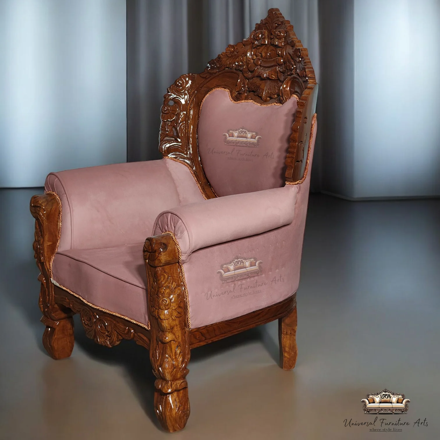Crafted from high-quality solid wood, the frame features exquisite hand carvings on the backrest, arms, and legs, showcasing the skill of expert artisans. The plush cushioned seat and backrest are upholstered in premium fabric, offering unmatched comfort along with visual appeal.