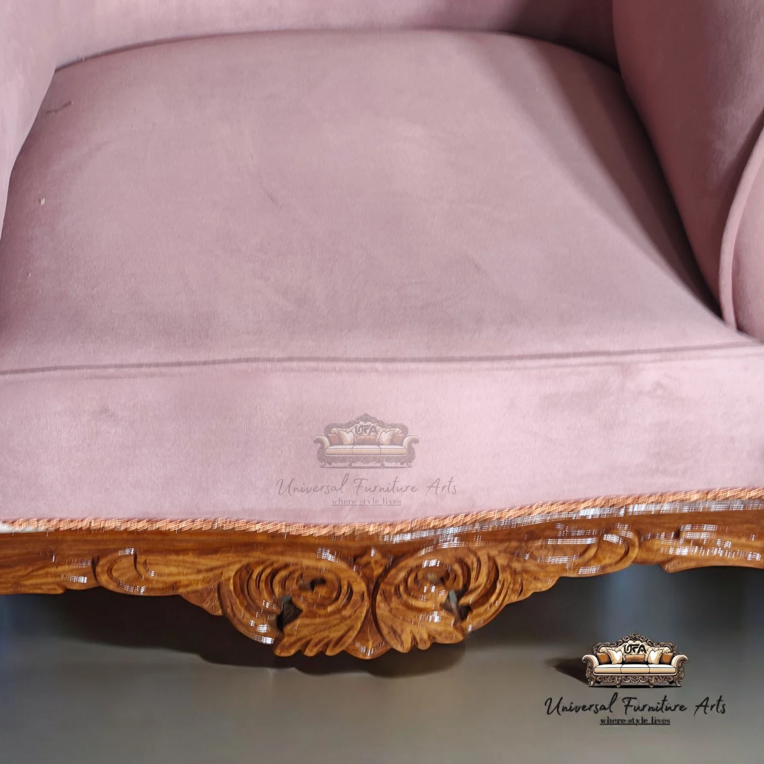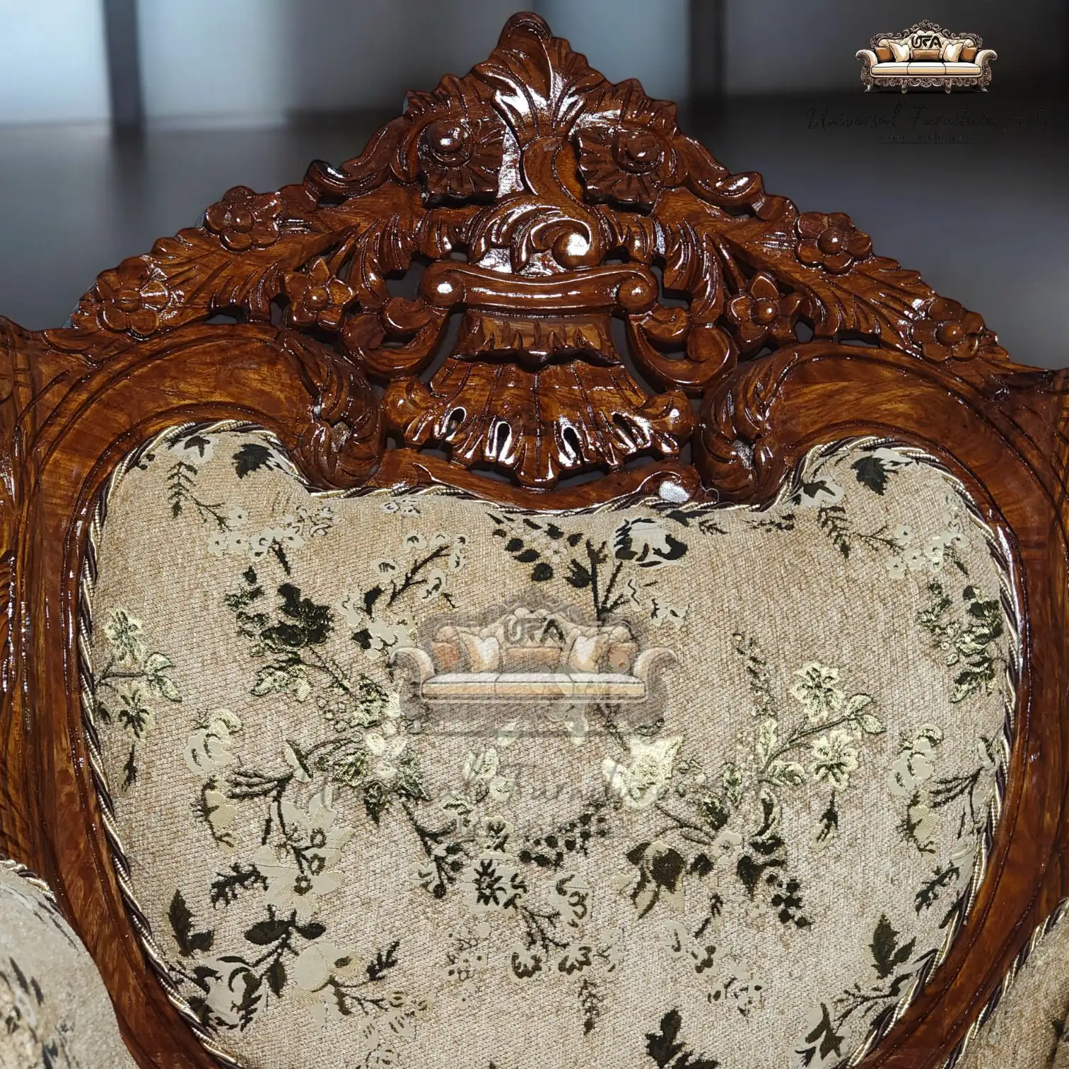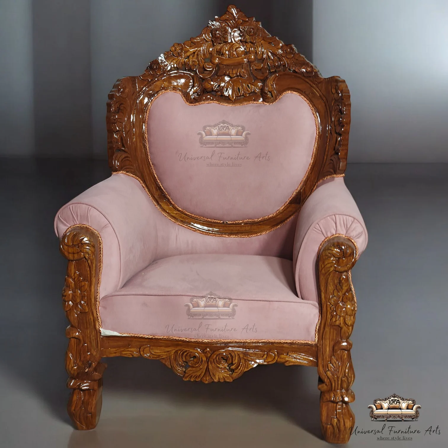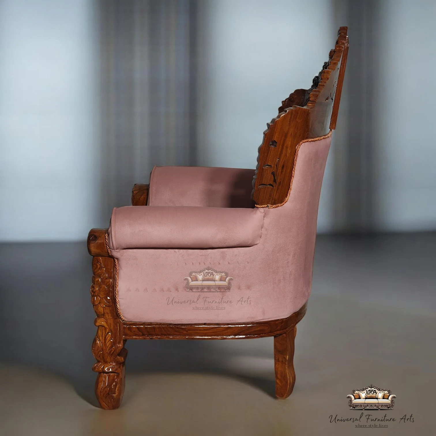 Crafted from high-quality solid wood, the frame features exquisite hand carvings on the backrest, arms, and legs, showcasing the skill of expert artisans. The plush cushioned seat and backrest are upholstered in premium fabric, offering unmatched comfort along with visual appeal.