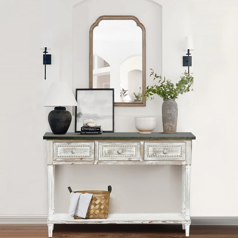 Elevate your home decor with the Natural Art & Crafts Sela Handmade Teak Wood Console Table, beautifully crafted from solid teak wood in an elegant antique white finish. This versatile piece features three spacious drawers and a bottom shelf, offering stylish storage for any room in your home. Its farmhouse and rustic design perfectly complements entryways, hallways, living rooms, or bedrooms. With its compact, narrow structure, this console table maximizes space while adding timeless charm to your interior. Perfect for displaying decor, organizing essentials, or serving as a functional entryway table.